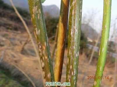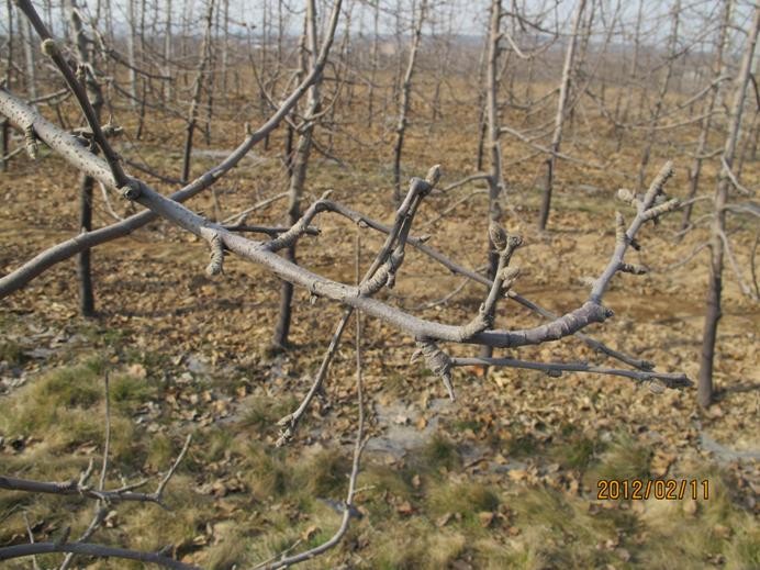 2.枝條:枝條的凍害與其成熟度有關(guān)。成熟的枝條在休眠期以形成層最抗寒,皮層次之,而木質(zhì)部、髓部最不抗寒;在生長(zhǎng)期則相反,形成層抗寒力最差,入秋時(shí)未木質(zhì)化易受凍害。多年生枝條凍害表現(xiàn)為局部?jī)鰝?,受凍部分最初稍變色下陷,不易發(fā)現(xiàn)。如用刀切開,會(huì)發(fā)現(xiàn)韌皮部變褐;枝條凍傷處變褐后,從變褐部位以上的枝條逐漸干枯死亡。韌皮部裂開變褐脫落,但如果形成層未受凍則還可以恢復(fù)。特別是成熟不足的先端枝條對(duì)嚴(yán)寒敏感,常先發(fā)生凍害,輕者髓部變色,重者枝條脫水干縮甚至凍死。