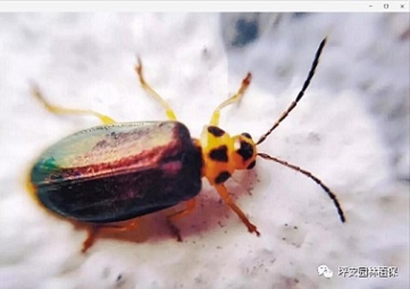 成蟲:體長8mm,黃褐色,鞘翅綠色,有金屬光澤;頭頂有一個三角形黑斑;前胸背板中央有一個葫蘆形黑斑,兩側各有1個卵形黑斑。且有2條明顯的隆起線。