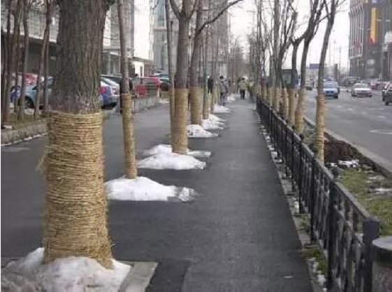 入冬前用草繩、無(wú)紡布、尼龍布等材料樹(shù)木的主干及部分主枝包起,主干卷干高度不低于分枝點(diǎn)高度的三分之二。