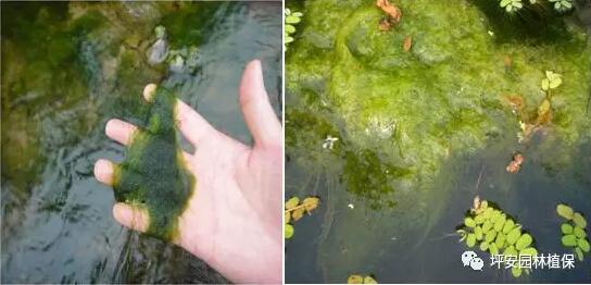 ⑵水體中大量生長(zhǎng)繁殖的藍(lán)、綠藻在水體表面形成一層綠色浮渣,使水質(zhì)渾濁,透明度明顯降低。