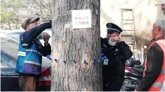 志愿者先用電鉆在樹干上鉆了一個(gè)4~5厘米深的小洞,然后將一些制劑打入樹洞中。對(duì)此河道處的志愿者解釋道,他們給楊樹注射“飛絮抑制劑”,相當(dāng)于給樹木做“節(jié)育手術(shù)”,主要是抑制雌性楊樹花芽的形成,從而不產(chǎn)生飛絮,有效率達(dá)到95.7%。他們?cè)趯?duì)這些楊樹進(jìn)行鉆孔輸入抑制劑后,還會(huì)及時(shí)對(duì)鉆孔部位進(jìn)行處理。這樣連續(xù)治理三年后絮絮就基本沒有了。