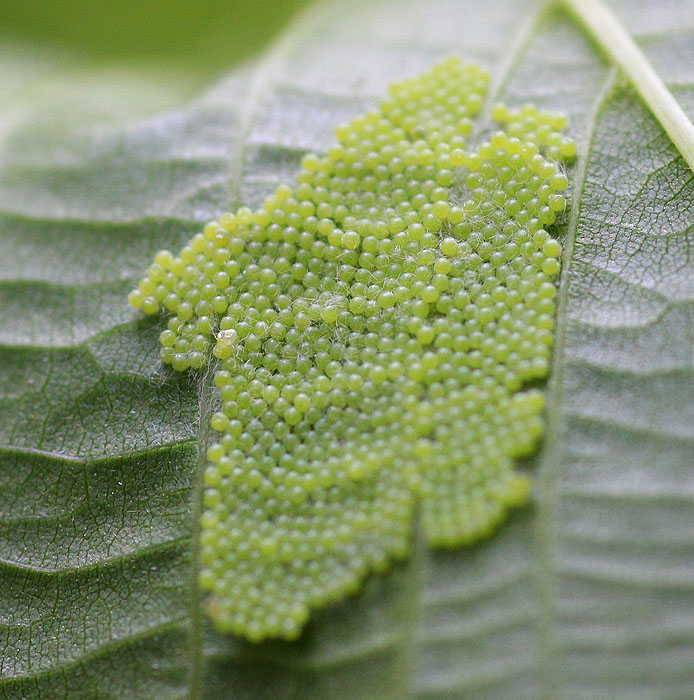 卵:圓球形,直徑約0.5mm,初產(chǎn)卵淺黃綠色或淺綠色,后變灰綠色,孵化前變灰褐色,有較強的光澤。卵單層排列成塊,覆蓋白色鱗毛。
