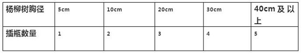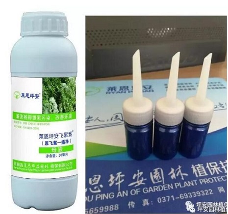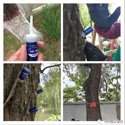 將裝有藥液體的小插瓶,每支小插瓶10ml在樹體鉆孔后,將插瓶插入樹體。