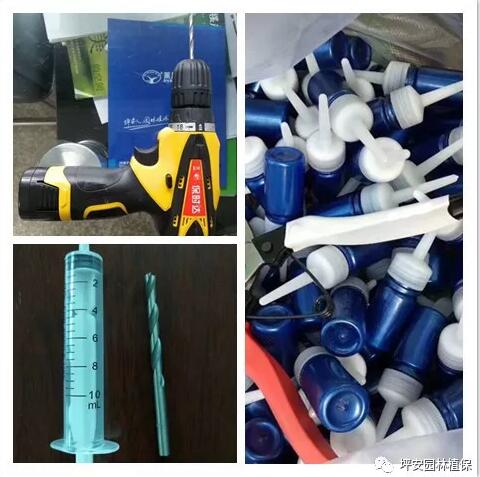 步驟一:飛絮競(母液和插瓶),電鉆,4.5mm鉆頭,10mL的針管,樹徑尺,純凈水;
