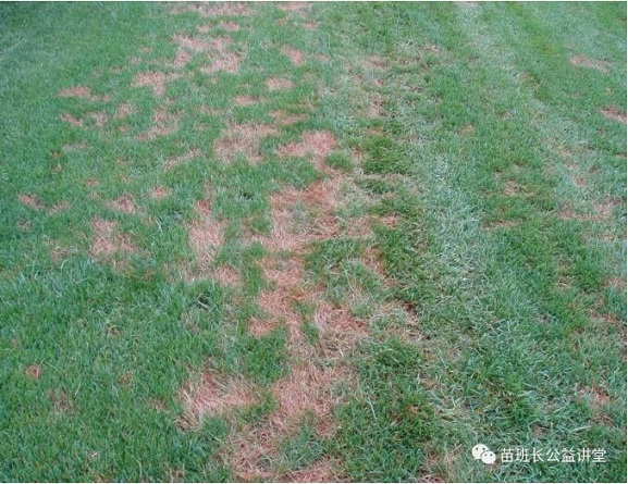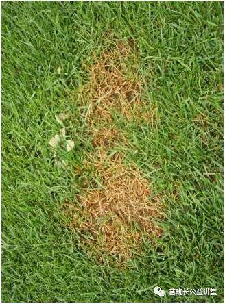 4、草坪上開始出現(xiàn)小的枯死斑點,但迅速擴展為不規(guī)則形枯草斑塊;