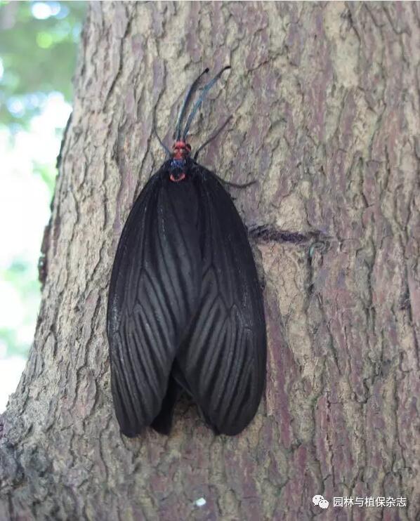 成蟲(chóng):體長(zhǎng)17-24 mm,平均19 mm;翅展 47-70 mm,平均61 mm。頭小,紅色,有黑斑。觸角黑色,齒狀,雄蛾觸角較雌蛾寬。前胸背面褐色,前、后端中央紅色。中胸背黑褐色,前端紅色;近后端有2個(gè)紅色斑紋,或連成“U”字形。前翅黑色,反面基部有藍(lán)光。后翅亦黑色,自基部至翅近端部(占翅長(zhǎng) 3/5)藍(lán)綠色。前后翅反面基斑紅色。后翅第二中脈和第三中脈延長(zhǎng)成一尾角。腹部紅色,有黑斑5列,目前而后漸小,但雌者黑斑較雄者為大,以致雌腹面的2列黑斑在第一至第五或第六節(jié)合成1列。雄蛾腹末截鈍,凹入;雌蛾腹末尖削,產(chǎn)卵器露出呈黑褐色。