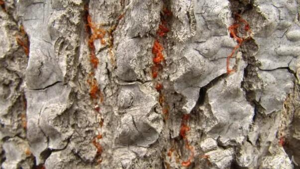 楊樹腐爛病表現(xiàn)為干腐和枝枯兩種類型。干腐型主要發(fā)生于主干、大枝及分叉處,發(fā)病初期病斑呈潰瘍癥狀,皮層內(nèi)部變軟腐爛,有酒糟氣味,后期病斑失水下陷,表面呈縱向開裂,纖維呈麻絲狀,易與木質(zhì)部剝離,病斑上有黑色針頭狀凸起,條件適宜時(shí)病斑橫向擴(kuò)展包圍樹干一周,導(dǎo)致樹木死亡。 枝枯型主要發(fā)生在苗木、幼樹及大樹枝條上,發(fā)病初期無明顯潰瘍癥狀,病部迅速擴(kuò)展,環(huán)繞1周后,上部枝條枯死。