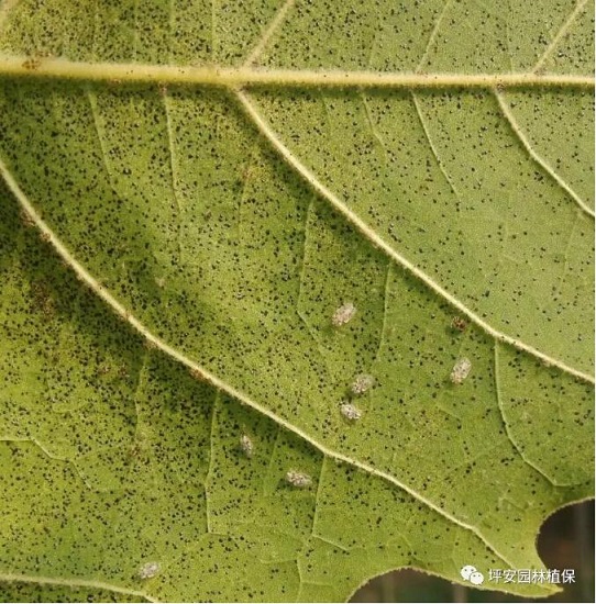 法桐方翅網(wǎng)蝽主要在葉片背面吸食植物汁液