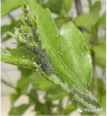 木槿蚜蟲在一年的春、夏、秋季節(jié)均有發(fā)生。木槿受害后葉片發(fā)黃,皺縮畸形,嚴(yán)重時(shí)植株枯死。蚜蟲排泄物還能誘發(fā)煤污病。