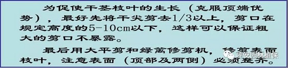 1、定植后修剪。定植時按規(guī)定高度、寬度剪去多余部分,對于主干粗大的用手剪,注意不要使主枝劈裂,后用大平剪修平面(大平剪要端平)。