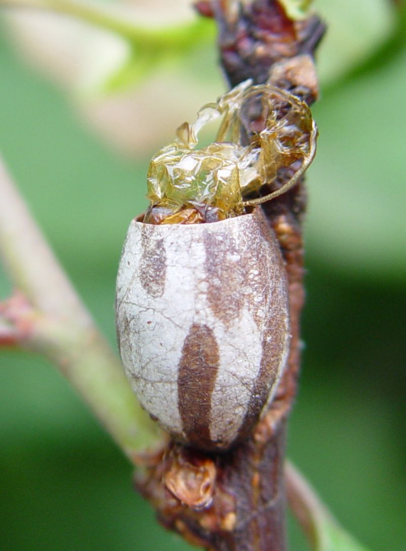 蛹:長11~13毫米,橢圓形,肥大,黃褐色。繭石灰質(zhì)堅硬,橢圓形,繭上有數(shù)條灰白色與褐色相間的縱紋,似麻雀蛋,緊貼于枝干上。