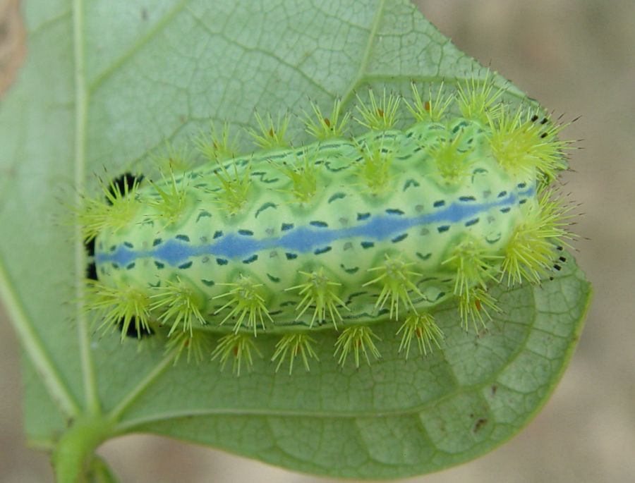 幼蟲:老熟幼蟲體長25至28毫米,寬7至8.5毫米,略呈長方形,初黃色,后稍大為黃綠至綠色。頭小,黃褐色,縮于前胸下。前胸盾上有l對黑斑,背中線黃綠至淺藍色,亞背線部位有10對刺突,氣門下方有8對刺突,刺突黃綠色,生有毒毛,毒毛頂端近棕褐色,氣門上線及氣門線呈藍、黃色相間的縱帶。胸足淺黃綠色,無腹足,每腹節(jié)的中部有1個扁圓形的吸盤,腹部共有7個吸盤。腹末有4個毛瘤叢生藍黑刺毛,呈球狀。其毒毛有刺,傷人痛癢難忍,所以俗稱洋辣子。