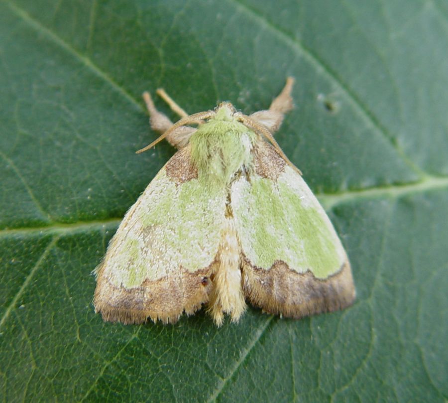 成蟲:體長15至16毫米,翅展36至40毫米,體綠色;復眼黑褐色。頭胸背綠色,胸背中央有1條棕色縱線,腹部灰黃色。下唇須棕色。前翅綠色,基部有1暗褐色大斑,外緣為灰黃色寬帶,帶上散有暗褐色小點和細橫線,帶內(nèi)緣內(nèi)側有暗褐色波狀細線。翅背面灰綠色。前翅的前緣與外緣及后翅前緣呈暗褐色,前后翅緣毛淺棕色。觸角褐色,雌蟲觸角絲狀;雄蟲觸角近基部十幾節(jié)為單櫛齒狀。