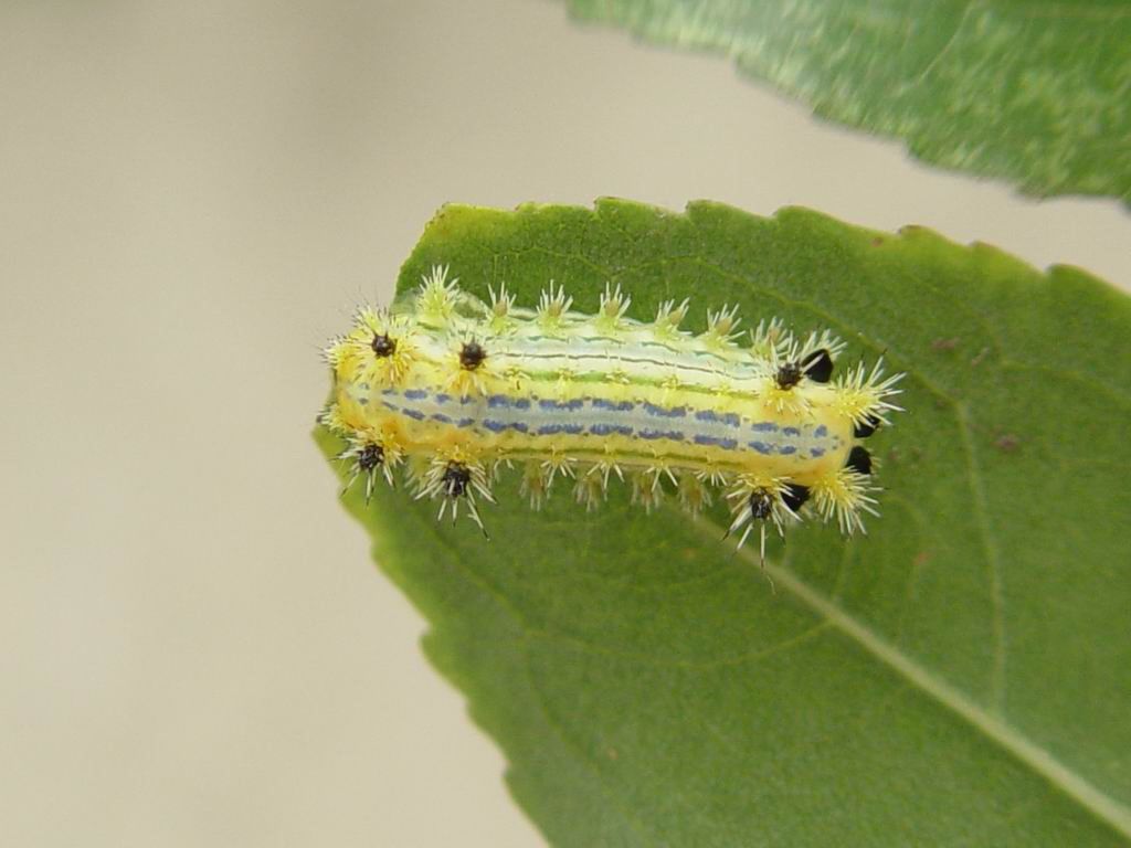 幼蟲:體長15~20毫米,頭小,棕褐色,縮在前胸下面,體黃綠色,前胸盾具1對黑點。背線兩側具藍綠色點線及黃色寬邊,側線灰黃色較寬,具綠色細邊。節(jié)生灰黃色肉質(zhì)刺瘤1對,以中后胸和8~9腹節(jié)的較大,端部黑色,第9、10節(jié)上具較大黑瘤2對。氣門上線綠色,氣門線黃色,各節(jié)體側也有1對黃色刺瘤,端部黃褐色,上生黃黑刺毛。腹面色較淺。