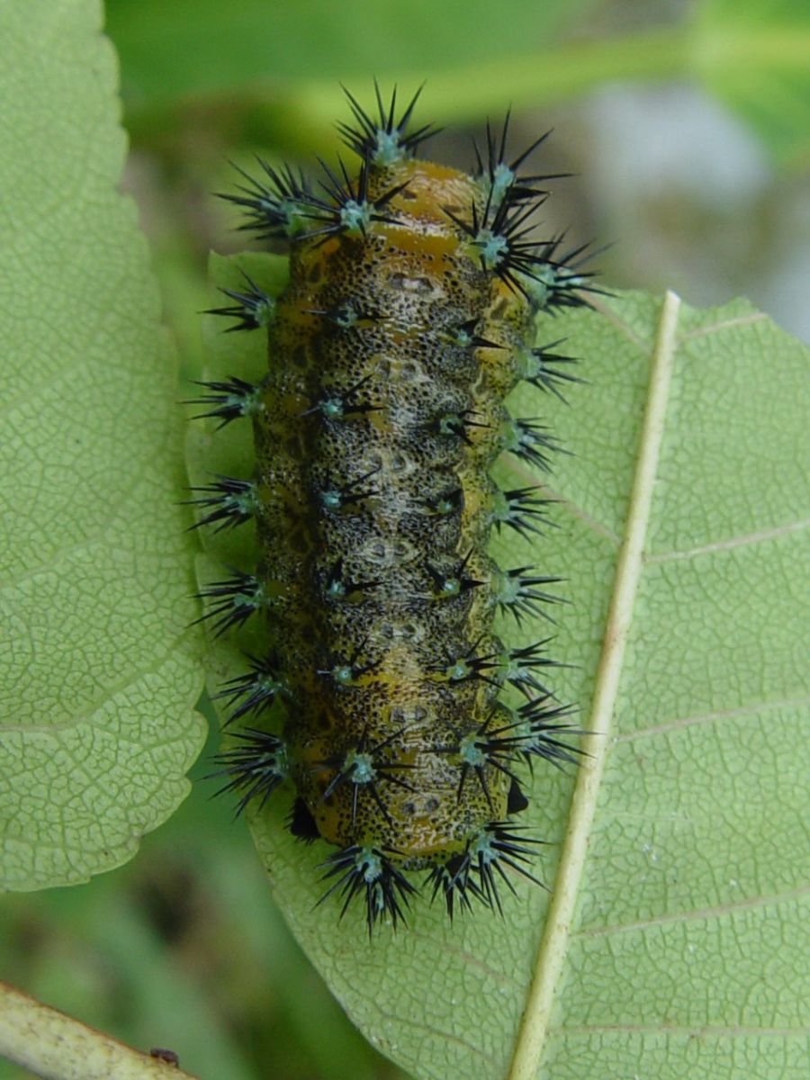 幼蟲:老熟幼蟲體長25毫米左右,圓筒形,黃綠色;背線較寬,天藍色,每節(jié)每側黑點兩個;亞背線和枝刺有黃色型和紅色型兩種;體側各節(jié)有天藍色斑1個,鑲淡色黃邊,斑四角各有黑點1個;中后胸和第4、7腹節(jié)背面各有粗大枝刺1對,后胸至第8腹節(jié)每節(jié)氣門上著生長短均勻的枝刺一對,各枝刺有端部棕褐色的尖刺毛。