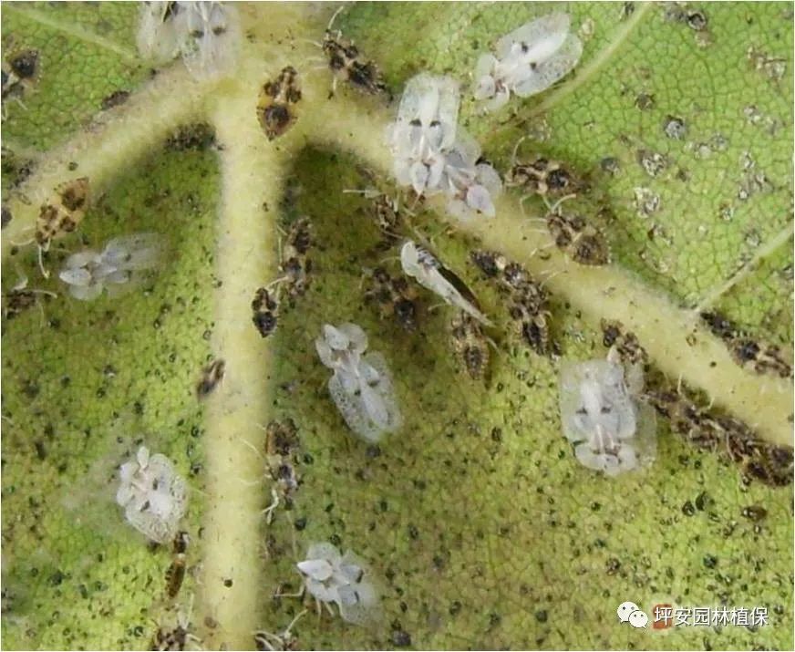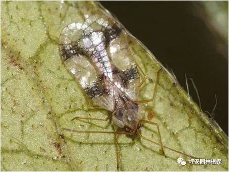 法桐方翅網(wǎng)蝽屬成蟲和若蟲主要寄生在葉片背面,刺吸汁液,抑制植物光合作用,影響植株生長,其危險性較大,不易除治。