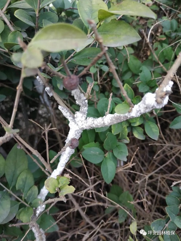 女貞白蠟蚧在女貞上的危害狀,嚴重時包裹整個枝干,造成樹勢衰弱干枯。