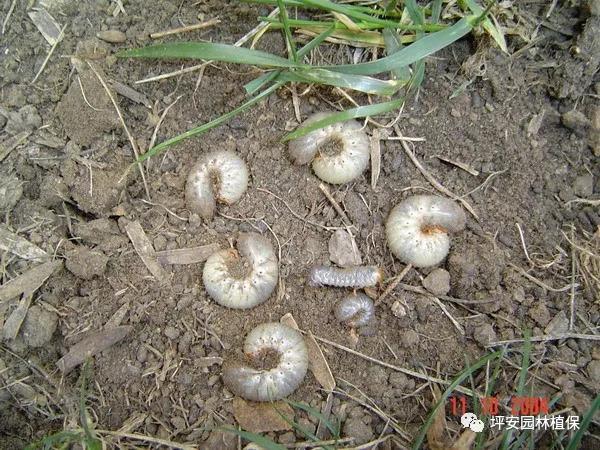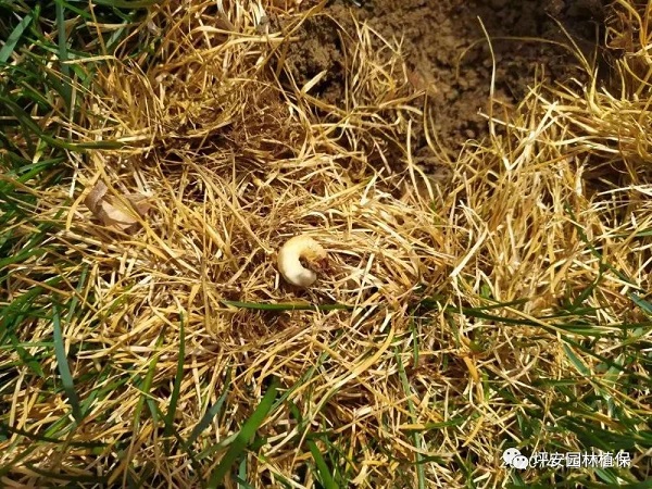 蠐螬又名核桃蟲,土蠶,是鞘翅目、金龜總科的幼蟲,是目前國內(nèi)公認的難防治的土棲類害蟲。蠐螬乳白色,頭橙黃或黃褐色,體圓筒形,身體呈“C”形蜷曲,體長35-45mm,具3對胸足。背上多橫皺紋,尾部有刺毛,生活于土中。草坪遭受蠐螬危害后,根莖被咬斷,斷口整齊平截,嚴重時草坪大片枯黃,受害的地塊連年發(fā)生危害并逐年加重。