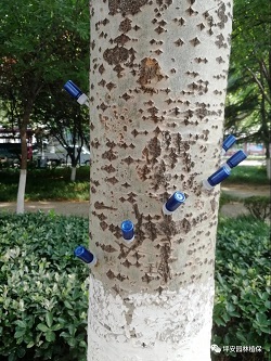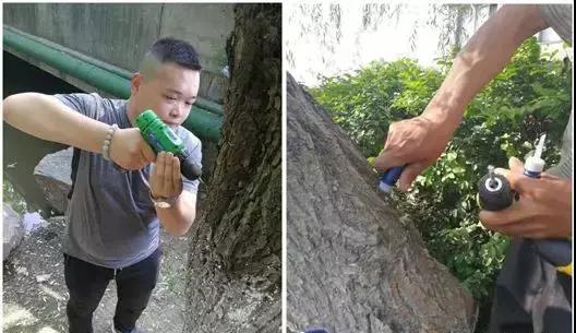 “射”即注射柳絮生長調(diào)節(jié)劑。飛絮是楊樹、柳樹雌株開花結果的產(chǎn)物,絮狀物里就是它們的種子。隨著果實的不斷成熟這種白色絮狀物種子飛出,隨風傳播。雌株開花前在樹身上注射生長調(diào)節(jié)劑,抑制花芽形成,開不出花來,自然就不會形成飛絮,達到控制飛絮污染的目的。目前市場上最具效果的應屬“絮靜”。