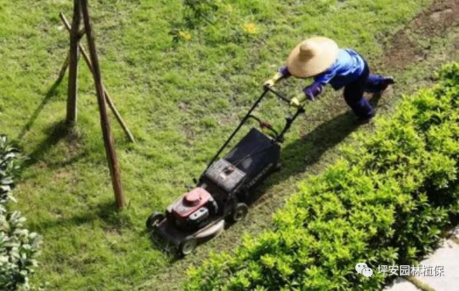 ⑤草坪修剪,基本上10-15天一次,高度保持在5-9公分左右。修剪時注意不要有明顯的漏剪痕跡,剪下的草屑及時清運,不得堆積在草坪里。