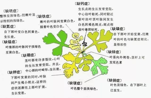缺氮時,植物生長勢弱,葉色淺綠,基部葉片發(fā)黃或呈淺褐色;缺磷時,葉片藍綠且略帶紫色;缺鉀時,老葉片淺綠,葉尖狹小,但葉脈仍呈綠色,一般不發(fā)生枯萎。應(yīng)該根據(jù)具體情況補充氮、磷、鉀肥。