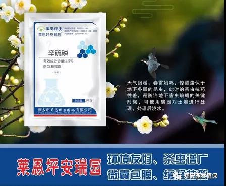 化學(xué)防治是防治園林地下害蟲最有效、最經(jīng)濟、最直接的防治措施?;瘜W(xué)防治具有比較高效、持效及經(jīng)濟等優(yōu)勢,在地下害蟲危害比較嚴重時作為應(yīng)急措施使用??墒褂萌R恩坪安瑞園進行防治地下害蟲,本品原藥使用除臭后的辛硫磷,刺激味道更小,對環(huán)境友好。采用微囊包裹緩釋技術(shù),持效期長,2-4kg均勻撒施333㎡然后再澆水。建議在05:00—06:00進行施藥,主要由于地下害蟲大多在夜間活動,既能快速殺死地表及淺層的害蟲,又能將較深土層中的害蟲殺死,對蠐螬、螻蛄、地老虎等具有較好的殺滅效果。