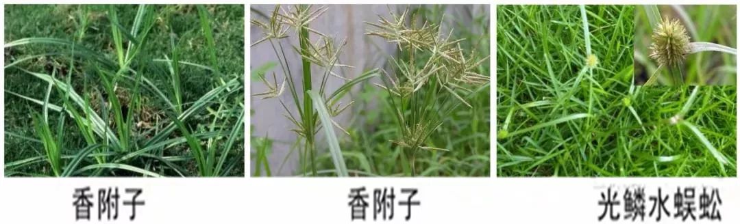 莎草科雜草的特征:葉片長條形;葉脈平行;莖切面為三角形;具有塊狀根。