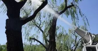 “噴”即對飛絮嚴(yán)重的楊柳樹可用高壓噴槍噴水的方法,每3至5天噴水一次,減少飛絮總量。