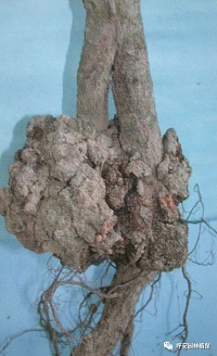 病害發(fā)生于根頸部位,也發(fā)生在側(cè)根上。最初病部出現(xiàn)腫大,不久擴(kuò)展成球形或半球形的瘤狀物,幼瘤為乳白色或白色,按之有彈力,以后變硬,腫瘤可不斷增大,表面粗糙,褐色或黑褐色,表面龜裂。 嚴(yán)重時(shí)地上部分表現(xiàn)為生長(zhǎng)不良、葉色發(fā)黃。苗木受害后根系發(fā)育不良,細(xì)根極少,根的數(shù)量減少,植株矮化,地上部生長(zhǎng)緩慢,樹(shù)勢(shì)衰弱,嚴(yán)重時(shí)葉片黃化、早落,甚至全株枯死。腫瘤可以2倍或幾倍于生長(zhǎng)部位的莖和根的粗度,有時(shí)可大到拳頭狀,引起幼苗迅速死亡。櫻樹(shù)的根癌病菌是通過(guò)各種傷口侵入植株,通常土壤潮濕、積水時(shí)發(fā)病嚴(yán)重,堿性土壤有利于發(fā)病。