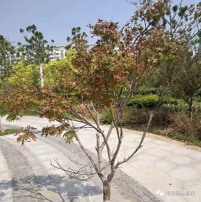 紅楓屬槭樹科槭樹屬,紅楓是雞爪槭的變種,品種較多,其葉形優(yōu)美,呈掌狀5—7裂,紅色持久,枝序整齊,層次分明,樹姿輕盈瀟灑,因而廣為栽培。紅楓性喜陽光,怕烈日暴曬,喜溫暖濕潤氣候,較耐寒,稍耐旱,不耐水澇,適生于肥沃疏松排水良好的土壤。