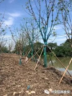 對以下情況的樹木(如喬木、灌木球、灌木柱等)一定要做好鋼管、杉木、鋼絲拉線等支撐,如移栽不久、枝干側(cè)重嚴(yán)重、樹體傾斜嚴(yán)重、種植地勢偏高、樹體受病蟲害危害嚴(yán)重、樹干空洞嚴(yán)重、冠幅大但樹穴小等樹木。支撐點一定要受力,且地面錨固位置要牢固。
