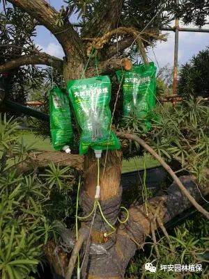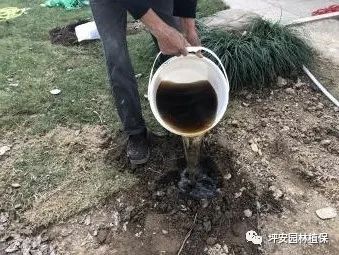 樹木扶正、定植后,使用“植物壹號+根恩帥+御豐”兌水進(jìn)行根部澆灌,促進(jìn)根系快速萌發(fā),達(dá)到補充樹體營養(yǎng)的作用,15天一次,連續(xù)2次。若土壤水分過高,建議先晾曬,再澆灌藥劑。