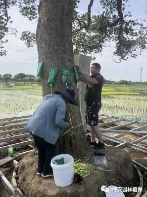 為維持樹體水分與養(yǎng)分的收支平衡,建議主干及時打孔注入“大樹營養(yǎng)液快線”,快速給樹體補充營養(yǎng),促進(jìn)受損樹木恢復(fù)樹勢。如遇高溫暴曬天氣,及時向樹冠噴霧蒸騰抑制劑“抑騰”,關(guān)閉葉片部分氣孔,降低樹體水分蒸發(fā),阻止樹勢衰弱。