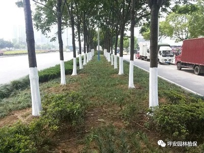 1、防凍防曬:樹干涂白后,可以增強(qiáng)樹干對(duì)陽光的反射能力,避免晝夜溫差過大,造成苗木的主干發(fā)生開裂。在秋冬時(shí)節(jié),樹木向陽面在白天受陽光照射,溫度上升,細(xì)胞解凍,夜晚溫度下降,又重新凍結(jié);這樣一凍一化,就會(huì)使樹木皮部組織死亡,產(chǎn)生“日灼”崩裂現(xiàn)象。樹木涂白后,穿上了“保暖衣”,增加了樹干對(duì)陽光的反射能力,溫度變化比較平穩(wěn),可以減少凍害,防止“日灼”。