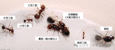 紅火蟻為地棲型蟻巢的螞蟻種類,筑巢于地下,營社會性群居生活,包括有翅的雄蟻、有翅的雌蟻、蟻后及職蟻(工蟻及兵蟻)有翅型個體。一般每年春季3~5月、秋季9~11月為紅火蟻的活躍期,5—10月是紅火蟻發(fā)生的高峰期。其覓食的土壤表面溫度范圍為12-51℃,在氣溫高于21℃時,覓食活動較頻繁,生長發(fā)育的最適溫度范圍為26-30℃。成熟的蟻群一年能產(chǎn)生4000~6000頭有翅生殖蟻。有翅生殖蟻在一年中的任何時間都可以進行婚飛活動。交配行為可能發(fā)生在90~300m的高空,一般交配1次。交配后的雄蟻很快死亡,雌蟻則隨風飛行,尋找地點筑新巢。