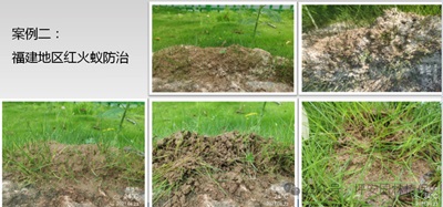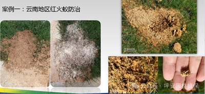 防治紅火蟻時,找到紅火蟻巢穴后將藥粉直接撒于巢穴表面即可,根據(jù)蟻穴大小可酌情增減用量。