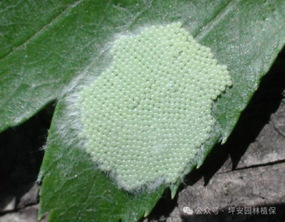 美國白蛾繁殖力極強,雌蟲常將卵產(chǎn)在樹冠外圍葉片的背面,產(chǎn)卵過程需要2-3天,平均每塊卵有500至700粒,多達2000粒。受溫度、濕度影響,卵期6至12天。