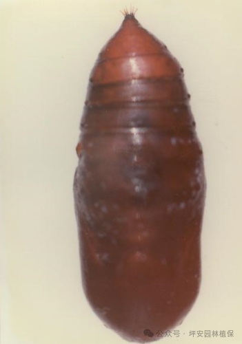 (4)蛹 體長9.0-12mm,寬3.0-4.5mm。初淡黃色,后變橙色、褐色、暗紅褐色。臀棘8-17根,每根棘的端部膨大,長度幾乎相等。蛹外包裹著稀松的混以幼蟲體毛的薄繭,呈灰白色,橢圓形。