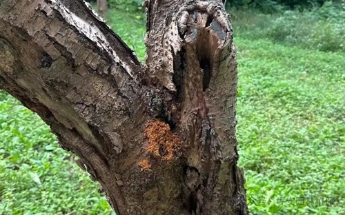 桑天牛、桃紅頸天牛、小蠹蟲等蛀干害蟲在5月中下旬集中產(chǎn)卵,蛀孔與機(jī)械修剪口并列成為主要侵染門戶;同時褐腐病、瘡痂病孢子借雨水飛濺至傷口,形成復(fù)合侵染。