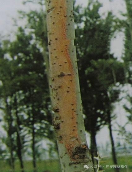 4. 伴隨癥狀:春季萌芽延遲、葉小發(fā)黃,夏季遇大風易從病部折斷。