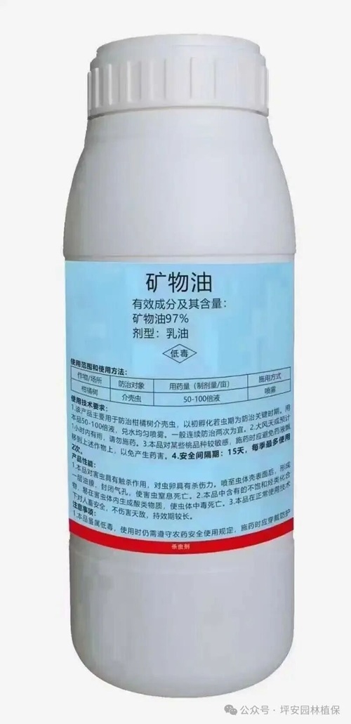 礦物油因其毒性低、害蟲無抗性、防治廣譜、環(huán)境友好等特點,被廣泛應(yīng)用于植物周年病蟲害的綜合防治。噴施后能快速封閉害蟲的呼吸系統(tǒng),使其窒息死亡,也可以與昆蟲的氣孔接觸,使其脂肪組織膨脹進而封閉氣孔,從而導(dǎo)致害蟲死亡。
